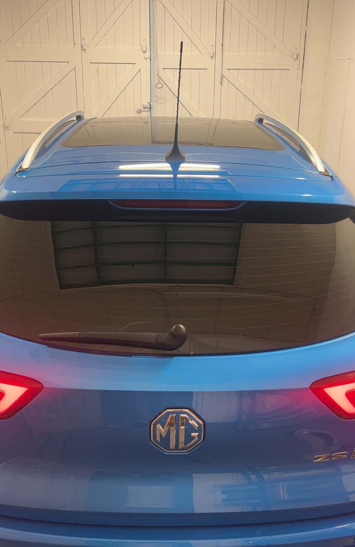 Rear glass tinted to balance privacy, UV protection, and a uniform look against the blue bodywork.